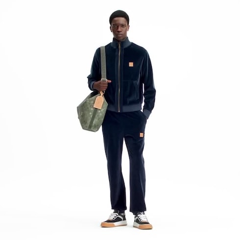 Track pants ini terlihat chic dalam balutan velvet bernuansa biru gelap, disertai aksen corduroy berwarna senada pada saku. Stopper beraksen mutiara menyajikan kesan dandy pada tali serut di bagian pinggang, sementara patch Marque L.Vuitton Déposée dari bahan VVN leather berwarna menghiasi bagian kaki kiri. Celana ini dapat dipadukan dengan track top yang serasi untuk tampilan kasual.