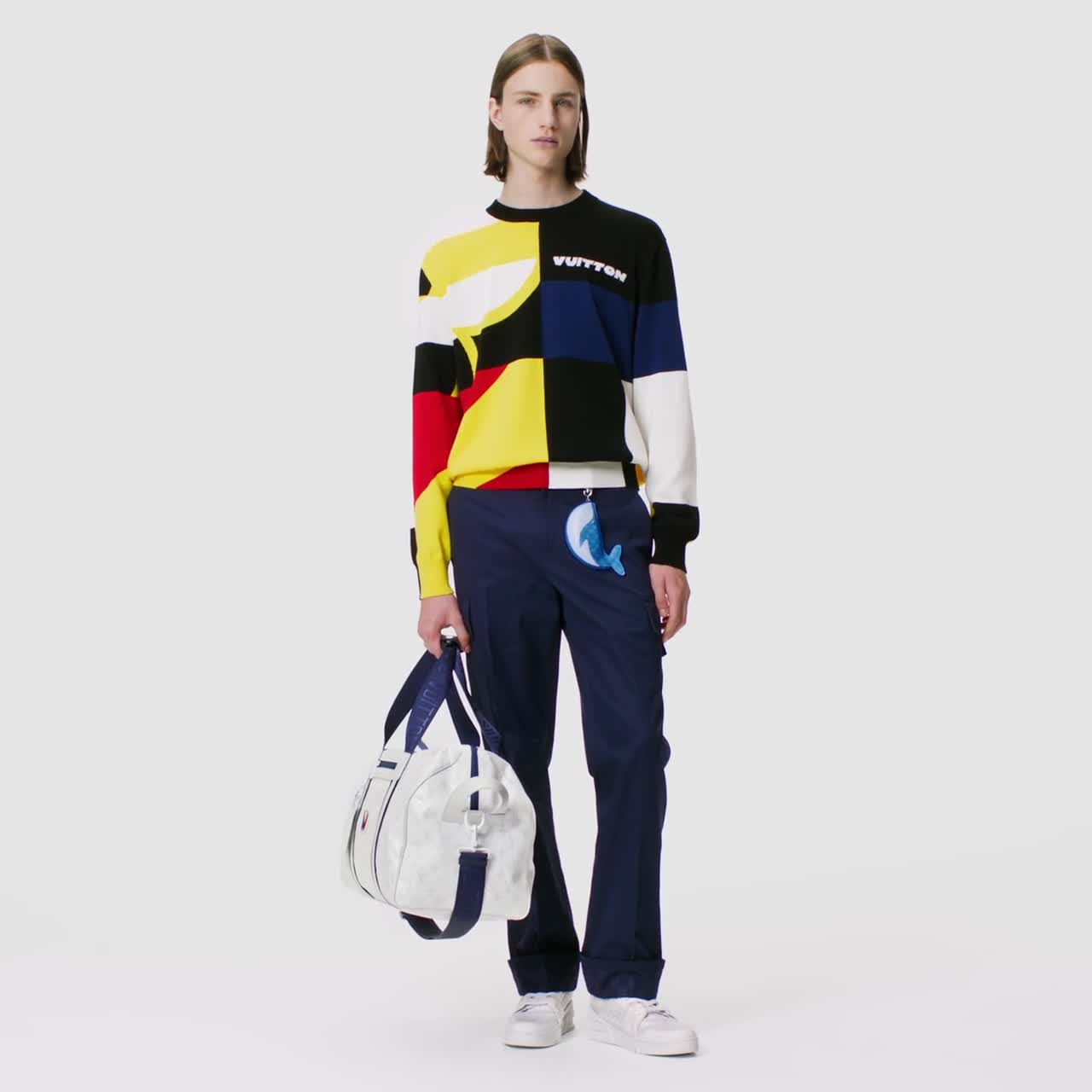 - Damier bernuansa senada dengan ‘Marque Louis Vuitton déposée’ signature pada bagian saku dan pergelangan kaki