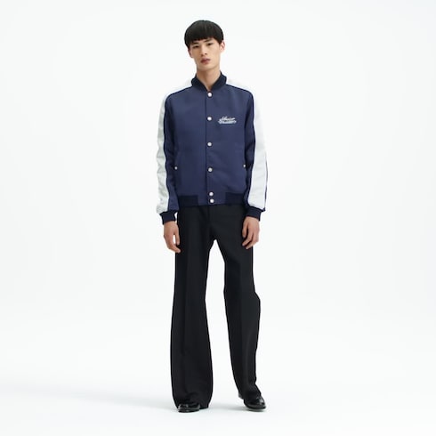 Souvenir jacket yang elegan ini dirancang dari bahan technical satin dalam nuansa warna biru navy. Bordir Louis Vuitton menghiasi bagian dada, sementara bagian belakang menampilkan bordir motif Monogram Horses Tapestry yang memukau di atas permukaan bermotif Monogram. Jaket kasual yang menawan ini dilengkapi detail band berwarna putih di bagian lengan dan kancing tekan beraksen mutiara.
