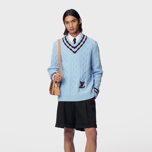 클래식한 실루엣에 유쾌하고 독창적인 감각을 담아낸 페일 블루 색상의 V넥 풀오버. 울 케이블 니트. 소매 부분의 스캘럽 디테일 및 소맷단과 칼라 주변의 대조적인 인따르시아 라인이 특징. 프레피한 분위기를 더욱 강조하는 밑단 주변의 대비를 이루는 LV 인따르시아 디테일. 봄에 활용하기 좋은 가벼운 레이어링 아이템.