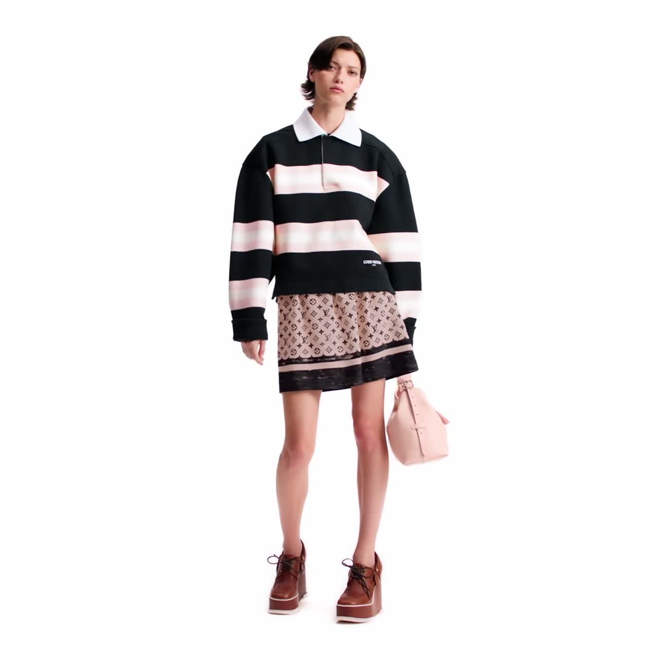 클래식한 디자인에 절제된 감각을 불어넣어 선보이는 인터록 면 저지 소재의 폴로 톱. 박시한 오버사이즈 핏. 그래픽하고 스포티한 스타일이 엿보이는 청키한 가로 스트라이프 패턴과 대조를 이루는 리브드 칼라 및 숨겨진 버튼으로 여미는 네크라인. 대담한 시그니처 감성을 더해주는 루이 비통 스카프 택.