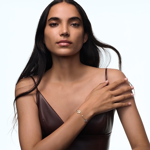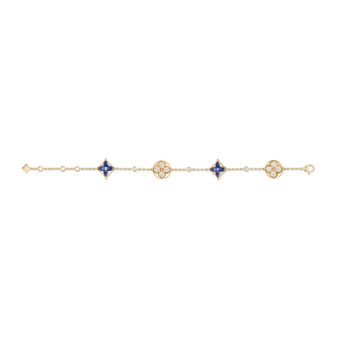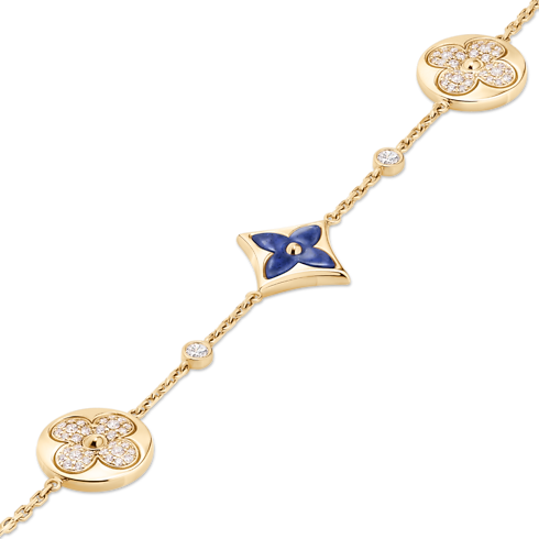 창립자의 아들 조르주 루이 비통이 1896년에 디자인한 상징적인 모노그램 플라워를 기념하는 고급스러운 컬러 블라썸 팔찌. 18K(750/1000) 옐로우 골드 소재. 소달라이트를 조각하고 수작업으로 폴리싱 처리해 광택을 선사하는 스타 및 선 모티프와 체인에 세팅된 브릴리언트 라운드 컷 다이아몬드가 특징. 수개월에 걸친 섬세한 작업으로 완벽하게 구현한 스톤의 은은한 곡선과 반짝임. 같은 컬렉션 내 다른 아이템과 믹스 매치하거나 레이어링하도록 초대하는 우아한 주얼리.