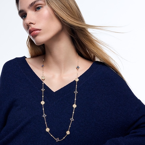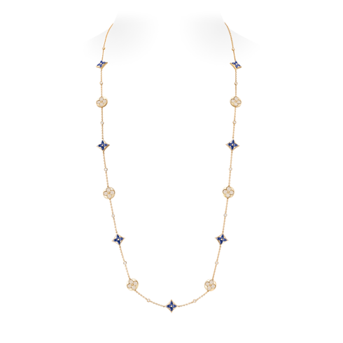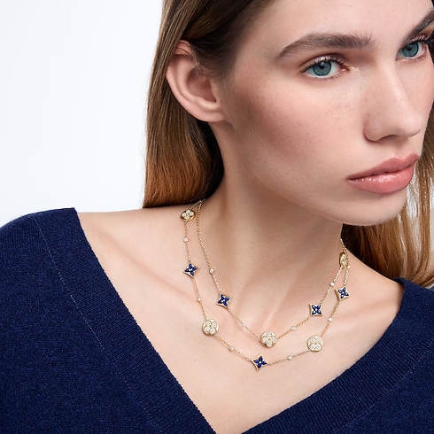 창립자의 아들 조르주 루이 비통이 1896년에 디자인한 상징적인 모노그램 플라워를 기념하는 긴 컬러 블라썸 목걸이. 18K(750/1000) 옐로우 골드 소재. 반짝이는 다이아몬드와 블루 색상의 소달라이트 스톤을 장식한 스타 및 선 모티프와 체인에 세팅된 브릴리언트 라운드 컷 다이아몬드가 특징. 수개월에 걸친 섬세한 작업으로 완벽하게 구현한 스톤의 은은한 곡선과 반짝임. 같은 컬렉션 내 다른 아이템과 믹스 매치하거나 레이어링하도록 초대하는 우아한 주얼리.