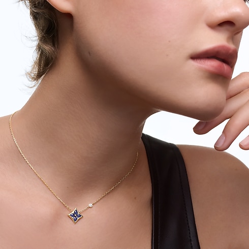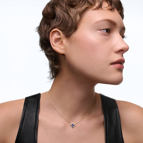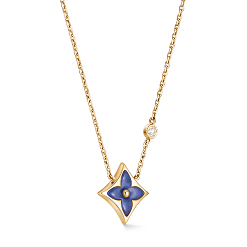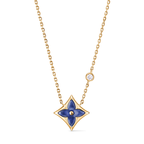 창립자의 아들 조르주 루이 비통이 1896년에 디자인한 상징적인 모노그램 플라워를 기념하는 고급스러운 컬러 블라썸 펜던트. 18K(750/1000) 옐로우 골드 소재. 소달라이트를 조각하고 수작업으로 폴리싱 처리해 광택을 선사하는 스타 모티프와 체인에 세팅된 브릴리언트 라운드 컷 다이아몬드가 특징. 수개월에 걸친 섬세한 작업으로 완벽하게 구현한 스톤의 은은한 곡선과 반짝임. 같은 컬렉션 내 다른 아이템과 믹스 매치하거나 레이어링하도록 초대하는 우아한 주얼리.