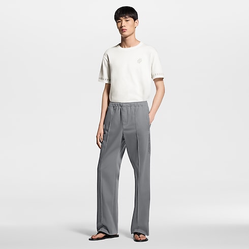 포멀하고 캐주얼한 분위기를 겸비해 자연스럽고 우아한 룩을 선사하는 페일 그레이 색상의 드로스트링 팬츠. 가벼운 울 혼방 새틴 크레이프 소재. 주름 디테일의 앞면과 편안하고 신축성 있는 웨이스트 밴드가 조화를 이루는 드레이핑 실루엣. 왼쪽 다리 부분에 실리콘 프린팅 기법으로 구현한 스포티한 루이 비통 레터링을 더해 현대적인 매력을 가미한 아이템. 이번 컬렉션의 플로럴 모티프와 매치해 세련된 봄철 룩을 연출할 수 있는 스타일.
