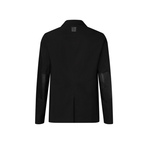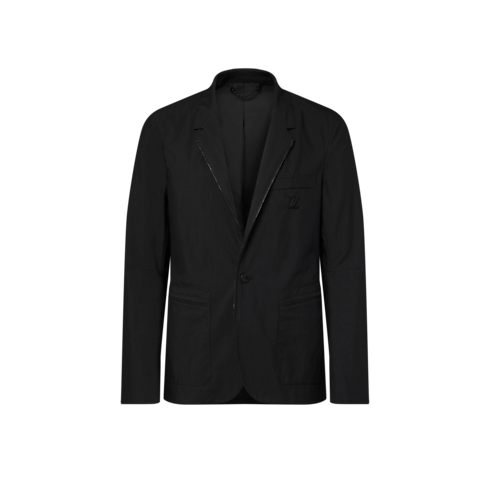 우아한 실루엣에 유틸리티 감성을 담아 선보이는 블랙 색상의 싱글 브레스티드 재킷. 테크니컬 면 립스톱 소재. 여름에 어울리는 안감이 없는 디자인. 가장자리를 따라 지퍼를 장식한 라펠과 블랙 가죽 소재의 팔꿈치 패치. 가슴 포켓 부분의 LV 장식과 뒷면의 블랙 색상 가죽 소재의 Marque L.Vuitton Déposée 패치 디테일. 매칭되는 카고 팬츠와 함께 올 블랙의 시티 룩을 연출할 수 있는 아이템.