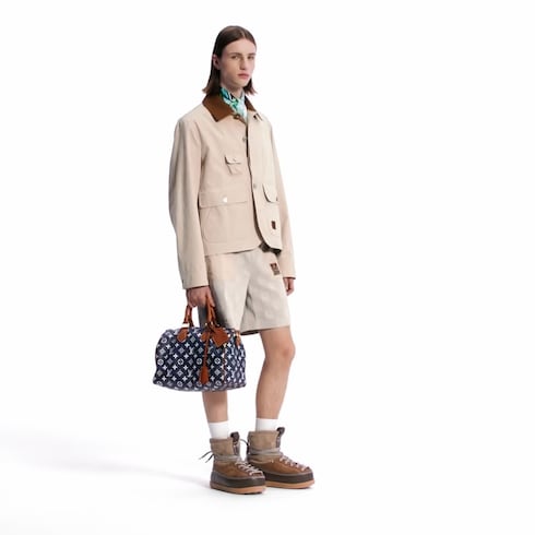 베이지 색상의 다미에 면 피케 소재로 선보이는 하이브리드 워크웨어 쇼츠. 각 다리 바깥쪽과 패치 포켓에 스포티한 컬러 블록 나일론 인서트를 장식한 디자인. 골드 색상의 금속 소재 끈 팁이 달린 리브드 디테일의 부드러운 드로스트링으로 구성된 허리 부분. 일본 디자이너 니고와 함께한 이번 시즌의 협업을 연상시키는 LV 재팬 라벨로 장식한 왼쪽 포켓. 매칭되는 풀오버와 함께 여유로우면서도 독특한 세트 룩을 연출할 수 있는 아이템.