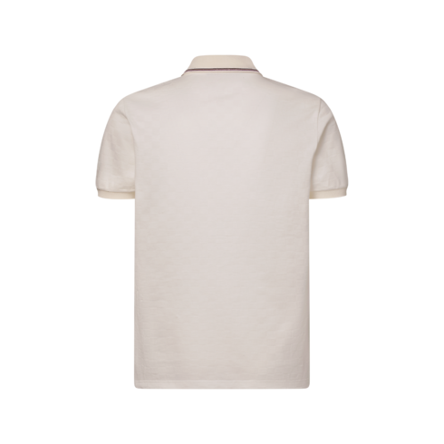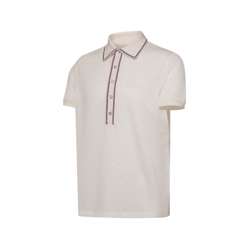 밀키 화이트 색상의 면 피케 소재로 선보이는 고급스러운 폴로 셔츠. 질감이 살아 있는 전체적인 다미에 및 가슴 부분의 톤온톤 L.V.M. 자수가 특징. 니트 칼라와 5-버튼 플래킷을 돋보이게 하는 대조적인 버건디 및 브라운 색상의 스트라이프. 골드 색상의 금속에 세팅된 자개 효과를 더한 버튼으로 댄디한 분위기를 선사하는 프레피한 아이템.