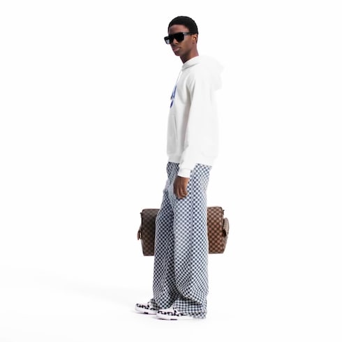 2025 가을-겨울 컬렉션에서 미니 다미에 패턴을 전체적으로 입혀 선보이는 와이드 레그 진. 워싱 처리한 오가닉 데님 베이스에 대조적인 화이트 색상의 원사로 그래픽한 모티프를 수놓아 부드러운 질감을 살린 디자인. 포켓에 장식한 진주 효과를 더한 리벳. 뒷면에 누벅 소재의 미니 다미에 자케론을 더한 여름철 감성의 시그니처 스타일.