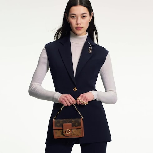 모노그램 캔버스 및 모노그램 리버스 캔버스 소재가 어우러진 도핀 체인 월릿(Dauphine Chain Wallet). 빈티지한 분위기, 송아지 가죽 소재의 트리밍, LV 서클 클래스프 등 아이코닉한 도핀 컬렉션의 시그니처 요소를 하나도 놓치지 않은 디자인. 깔끔하면서도 넉넉한 공간을 갖춘 아이템. 탈착형 골드 색상 체인을 활용하여 여러 가지 스타일로 연출 가능.