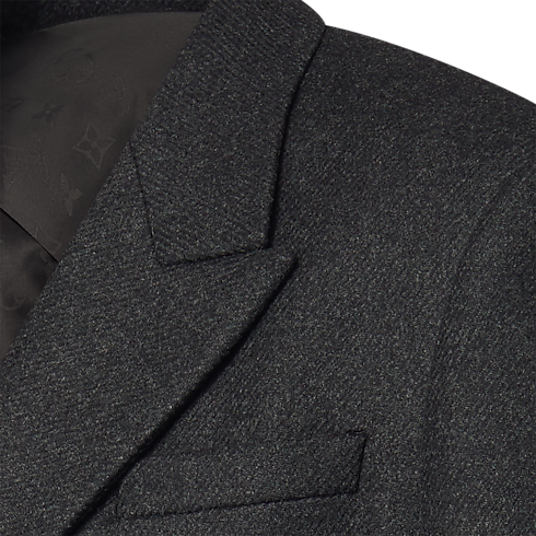 필수 남성 아이템인 더블 브레스티드 코트. 날렵한 테일러드 실루엣과 세련된 감각을 선사하는 짙은 앙트라시트 색조로 포멀한 룩을 완성해줄 디자인. 고급스러운 캐시미어 및 울 혼방 소재로 제작하여 겨울철에 활용하기 좋은 따뜻한 아이템. Marque L.Vuitton Déposée 시그니처가 있는 가죽 소재 탭으로 포인트를 준 뒷면.