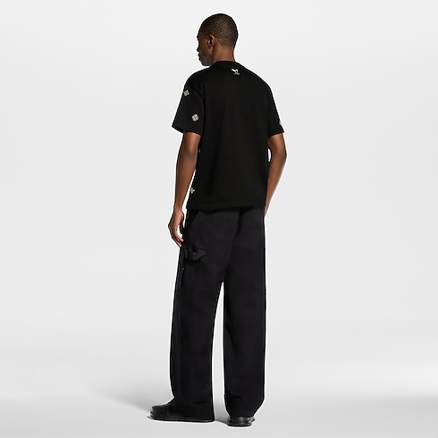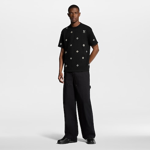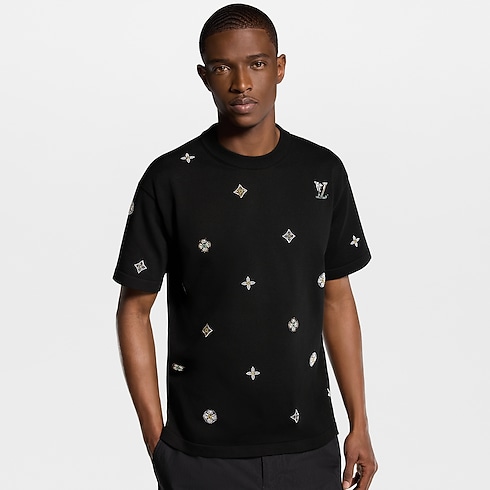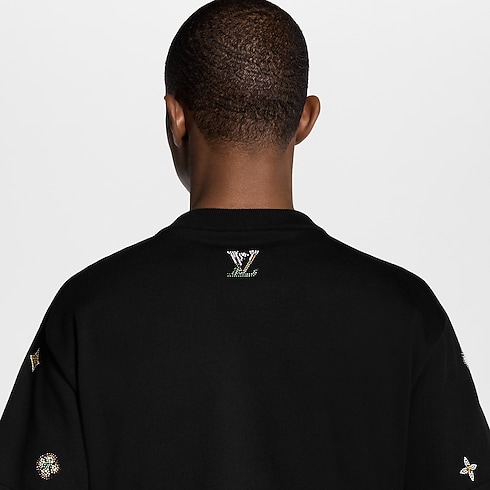 이번 컬렉션의 섬세한 LV 플라워 모티프를 장식한 세련된 블랙 색상의 반소매 크루넥. 오가닉 면 소재. 모노그램 플라워에서 영감을 받은 꽃 모티프와 LV 시그니처를 다채로운 라인스톤으로 구현하고 앞면과 소매, 뒷면에 더해 고급스러운 보석 같은 포인트를 준 디자인. 컬렉션의 다른 블랙 색상 아이템과 함께 강렬한 룩을 연출할 수 있는 스타일.