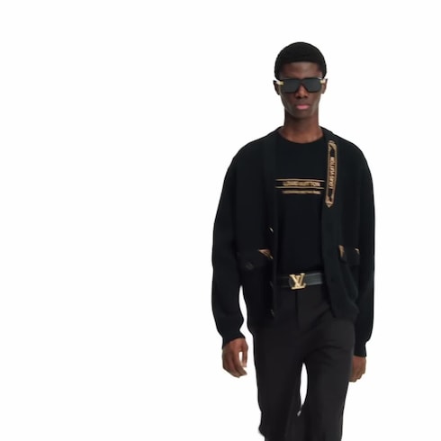 고급스러운 골드 색상의 자수를 수놓은 우아한 블랙 색상의 가디건. 왼쪽 칼라 부분에는 루이 비통 시그니처를, 플랩 포켓에는 모노그램 플라워 디테일을 더한 디자인. 따뜻한 날씨에 착용하기 좋은 가볍고 통기성 좋은 면 혼방 리브드 니트 소재. 이번 컬렉션의 테마인 크루즈 선박에서 전통적인 재킷을 대체해 세련되면서도 여유로운 이브닝 룩을 연출할 수 있는 스타일.