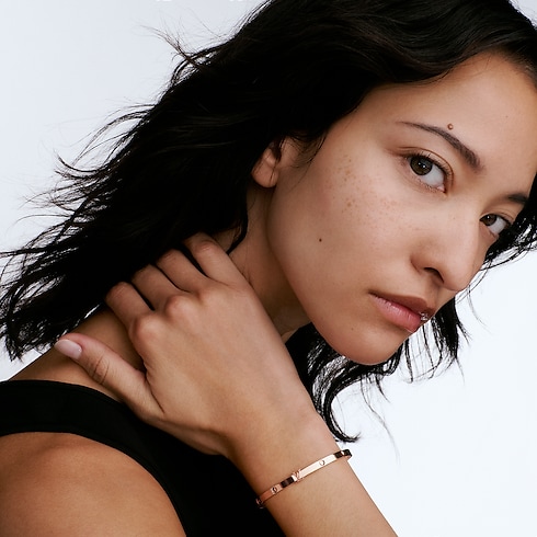 앙프렝뜨(Empreinte) 주얼리 컬렉션에서 선보이는 아이코닉한 뱅글. 하우스의 러기지 제작 헤리티지에서 영감을 받아 여행과 모험에 대한 찬사를 담은 아이템. 18K 핑크 골드 소재. 오리지널 루이 비통 트렁크를 장식한 네일을 연상시키는 디자인에 LV 시그니처를 더한 작고 우아한 젠더리스 스타일. 그래픽하고 현대적인 매력으로 시선을 사로잡는 팔찌. 컬렉션의 다른 주얼리와 레이어링하거나 믹스 매치하기 좋은 스타일.