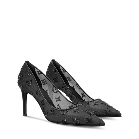 은은하게 발을 드러내는 반투명한 메시 소재의 갈라 펌프스. 시대를 초월하는 우아한 스타일. 메시 전체에 반짝이는 스와로브스키™ 라인스톤으로 하우스의 시그니처 모노그램 패턴을 구현한 디자인. 여성스러운 포인티드 토, 높은 힐, 고급 가죽 겉창이 조화를 이뤄 이브닝 룩에 연출하기 좋은 세련된 아이템.