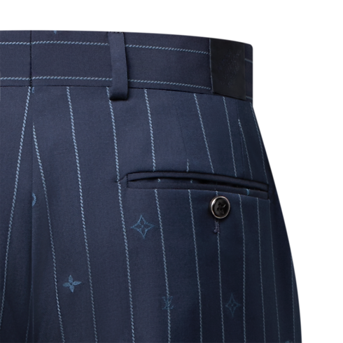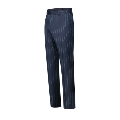 테일러링 코드로 클래식한 핀스트라이프 모티프를 재창조해 선보이는 네이비 블루 색상의 시가렛 팬츠. 톤 배색 모노그램 핀스트라이프 자카드의 스트라이프 사이에 모노그램 요소를 여기저기 배치한 디자인. 고급스러운 울 소재. 매칭되는 재킷과 함께 착용하여 세련된 비즈니스 수트를 연출할 수 있는 아이템.