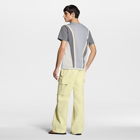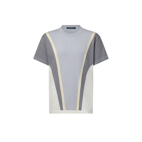 그래픽한 반소매 크루넥. 부드러운 파스텔 색조를 입힌 스포티한 분위기의 인따르시아 니트. V 형태가 허리까지 이어지며 체형을 돋보이게 하는 디자인. 칼라 아래 장식된 양각 처리한 톤온톤의 LV 시그니처 디테일. 컬렉션의 편안한 팬츠나 쇼츠와 매칭해 데일리 룩에 스포티한 포인트를 줄 수 있는 아이템.