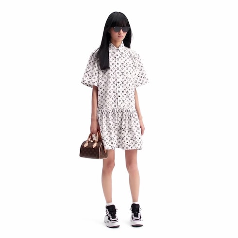 팝 아트에서 영감을 얻어 선보이는 이번 시즌 특유의 그래픽한 모노그램 모티프를 전체적으로 프린트해 강렬한 여름철 감성을 자아내는 셔츠 드레스. 면 포플린 소재. 클래식한 테일러드 스타일의 상단 부분. 반소매, 스마트한 칼라 및 앞면 버튼. 스커트의 힙 부분에 개더 디테일로 실루엣에 가벼운 볼륨감을 더한 디자인.