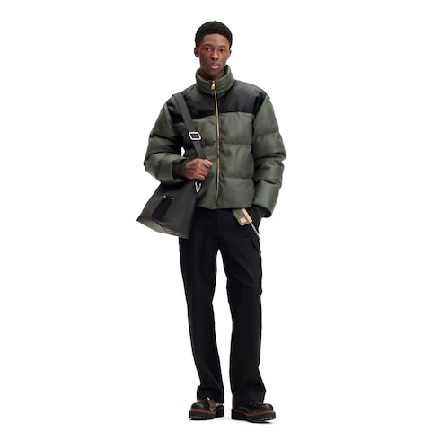 따뜻하면서도 가벼운 에코다운© 충전재를 더한 매우 부드러운 나파 가죽 소재의 고급스러운 다운 재킷. 매끄러운 다크 그레이 색상의 바디와 소매가 음각 처리한 모노그램 모티프를 장식한 블랙 색상 그레인 가죽 소재의 요크와 대비를 이루는 아이템. 목과 손목을 따뜻하게 감싸는 스탠드 칼라 및 리브드 디테일의 니트 소맷단. 숨겨진 드로스트링으로 추위를 더욱 막아주는 허리 부분.