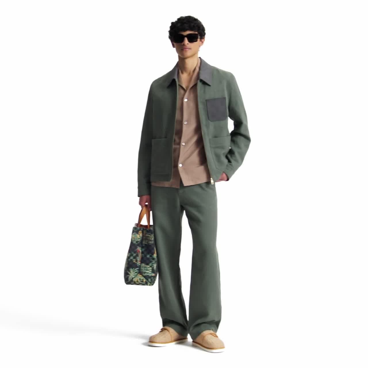 여름 감성을 자아내는 다크 그린 색상의 가벼운 리넨 캔버스 소재로 선보이는 팬츠. 뒷면의 누벅 다미에 자케론이 돋보이는 미니멀한 실루엣. 데일리 룩에 어울리는 활용도 높은 스타일. 매칭되는 워크웨어 재킷과 함께 현대적인 세트 룩을 연출할 수 있는 아이템.