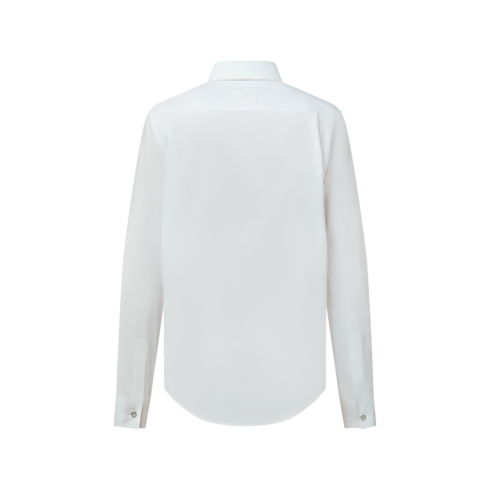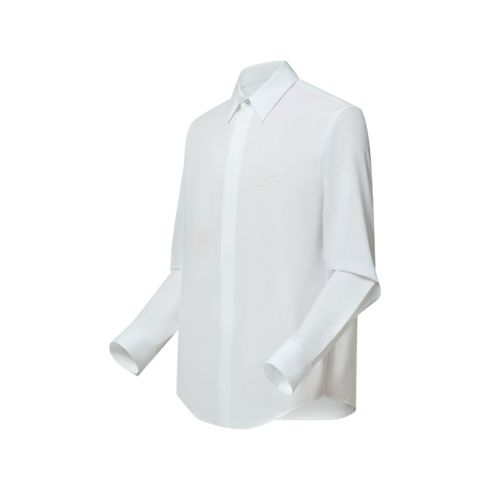숨겨진 우아한 버튼 플래킷을 구성하여 특별히 연말연시의 이브닝 룩에 잘 어울리는 테일러드 셔츠. 면 소재의 긴소매 디자인. 질감을 강조하는 양각 효과를 준 가슴 부분의 LV 리본 시그니처 자수와 유려한 실루엣이 대비를 이루는 아이템. 테일러드 룩과 시대를 초월하는 세퍼레이트 룩을 자연스럽게 연출할 수 있는 필수 아이템.