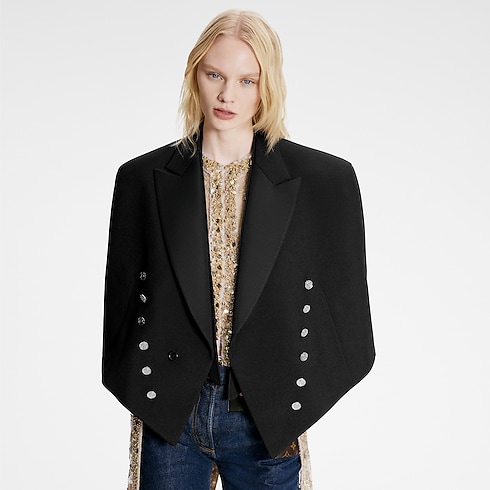 With this essential runway style, Nicolas Ghesquière revisits a heritage spencer jacket with a contemporary approach to masculine/feminine codes. Tailored from mohair-nylon drill in an exaggerated angular cut with cape-like sleeves and a cropped back for an elegant eveningwear feel. A striped loose collar adds a graphic detail, while the collection’s signature silver buttons complete the look.