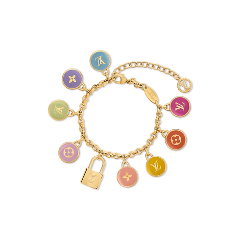 즐거운 축제 분위기에서 영감을 받은 LV 컨페티 팔찌. 화사한 색상으로 데일리 룩에 생기 넘치는 포인트를 더해주는 경쾌한 디자인. 골드 색상 금속 소재. 다채로운 디스크에 장식된 아이코닉한 모노그램 플라워와 LV 이니셜 디테일. LV 패드락 참을 더해 하우스 고유의 감성을 선사하는 유쾌하고 시선을 사로잡는 팔찌.