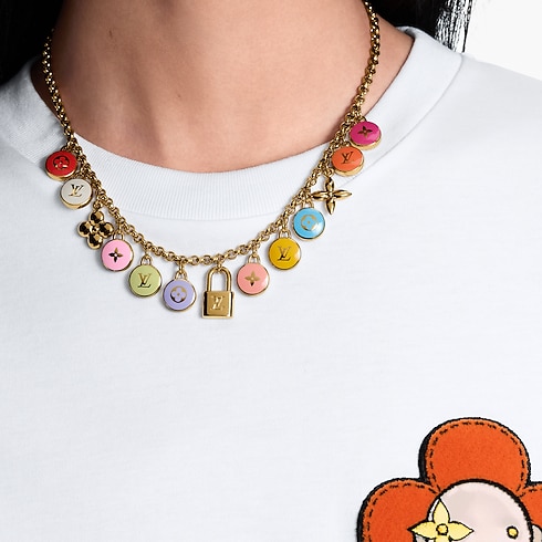 대담하고 유쾌한 디자인의 LV 컨페티 목걸이. 하우스의 사랑받는 시그니처를 무지개처럼 화사하게 담아낸 주얼리. 아이코닉한 모노그램 모티프를 장식한 다채로운 디스크가 모노그램 플라워 및 LV 패드락과 함께 가느다란 골드 색상 금속 체인에 달려 있는 아이템. 어떤 룩에도 생기 넘치는 색상의 포인트를 더해주는 우아하고 매력적인 액세서리.