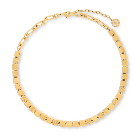 유쾌하면서도 우아한 LV 큐브 목걸이. 클래식한 다미에 패턴과 1932년 가스통 비통이 고안한 퍼즐 게임 파테키라는 하우스의 두 가지 역사적 아이콘에서 영감을 받은 디자인. 정교하게 연결된 골드 색조의 금속 큐브. 다미에 캔버스를 연상시키는 스트라이프와 루이 비통 파리 시그니처가 섬세하게 각인된 스타일. 일상은 물론 특별한 순간에도 완벽하게 어울리는 세련되고 시선을 사로잡는 아이템.