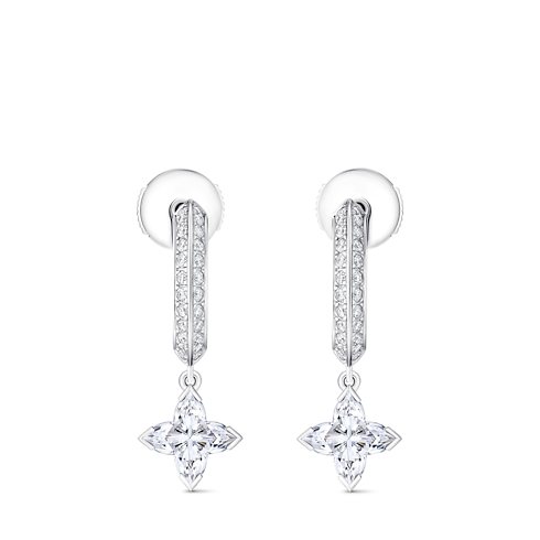 메종의 탁월한 주얼리 장인 정신이 엿보이는 18K 화이트 골드 소재의 LV 다이아몬드 파베 후프. LV 모노그램 스타 컷 다이아몬드가 돋보이는 디자인. 브릴리언트 라운드 컷 다이아몬드를 장식한 후프. 독특한 시그니처 감성을 담아내기 위해 루이 비통의 전설적인 모노그램 패턴의 스타일리시한 플라워 디자인을 반영한 센터 스톤 바스켓. 경쾌하고 다양하게 믹스매치할 수 있어 영원히 간직하고 기억할 만한 선물이 되어줄 주얼리.