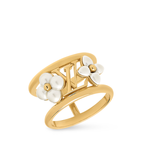 눈부시게 우아한 LV 플로라그램 XS 반지. 하우스의 유서 깊은 모노그램 시그니처와 자개가 가진 매혹적인 아름다움에서 영감을 받아 탄생한 아이템. 창의적인 오픈워크 디자인의 골드 색조 금속 밴드. 상징적인 LV 이니셜과 광채를 더하는 진줏빛 레진으로 장식된 두 가지 서로 다른 모노그램 플라워가 특징. 시선을 사로잡는 여성스러운 반지. 일상은 물론 특별한 순간에도 완벽하게 어울리는 주얼리.