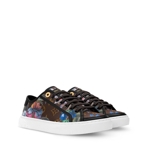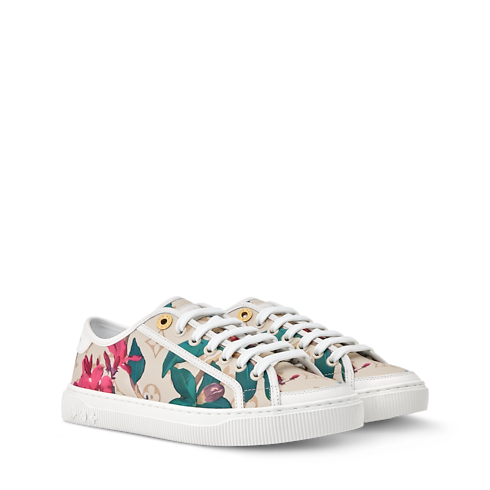 2026 봄-여름 패션쇼의 핸드백에 사용된 모노그램 친츠 패턴에서 영감을 받은 LV 라군 스니커즈. 로맨틱한 플로럴 모티프를 프린트한 모노그램 캔버스 소재의 상단 부분. 심플한 화이트 색상의 신발 끈. 루이 비통 시그니처를 장식한 화이트 색상 고무 소재의 겉창.