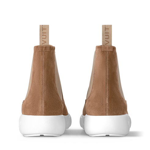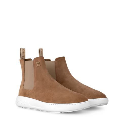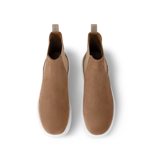 여유로운 스타일의 LV 퍼시픽 첼시 부츠. 벨벳처럼 부드러운 스웨이드 송아지 가죽으로 이루어진 상단부분과 청키하면서도 매우 가벼운 고무 소재의 겉창. 상단 부분에 장식된 톤온톤 LV 이니셜 액세서리 및 겉창에 음각으로 새긴 세 개의 모노그램 플라워가 특징. 신축성 있는 옆면 패널 덕분에 쉽게 신고 벗을 수 있는 아이템.