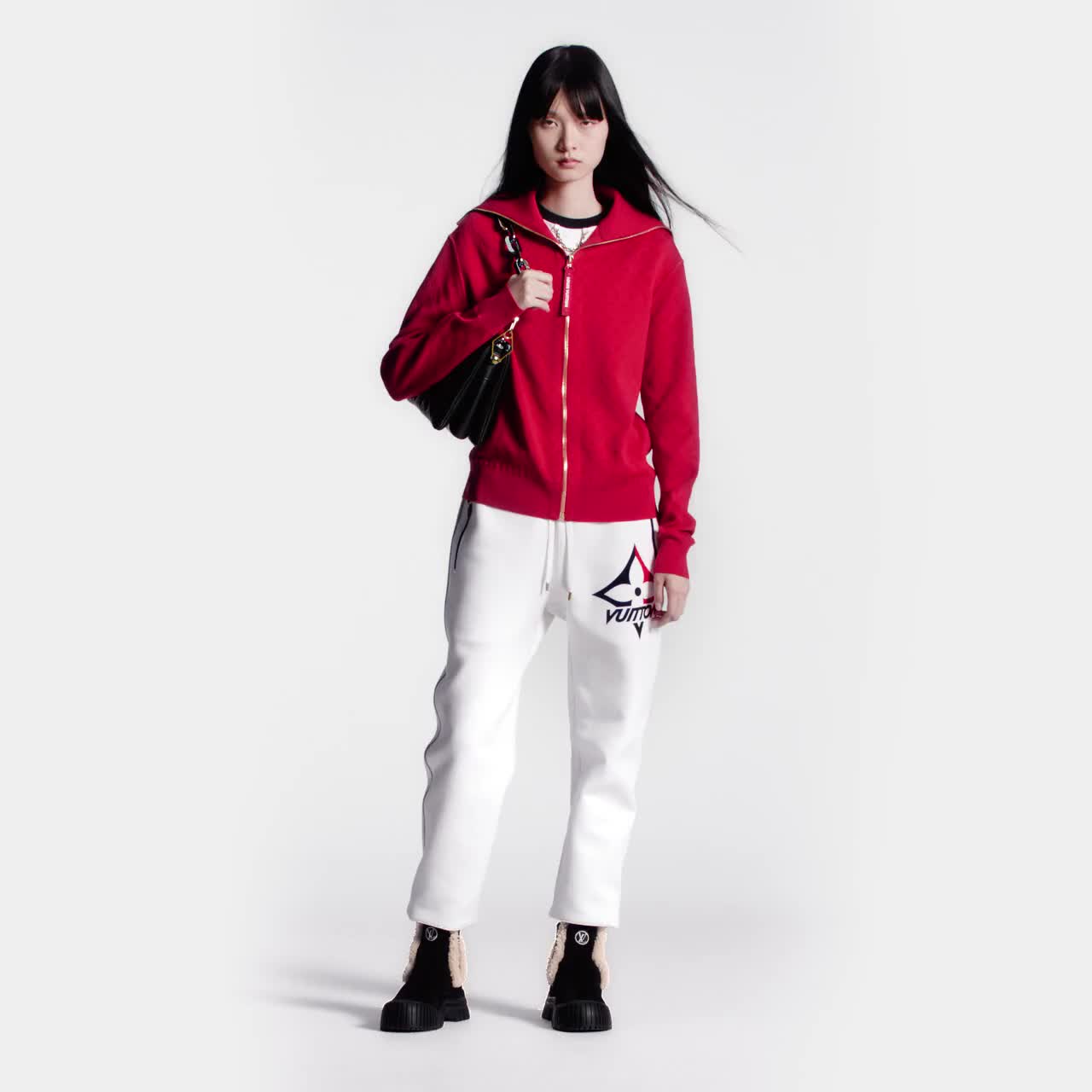 산뜻하고 스포티한 매력을 자아내는 면 인터록 저지 소재의 조깅 팬츠. 그래픽한 감각을 더하는 발목 부분의 대조적인 리브드 디테일 및 옆면의 잠겨진 포켓. 프랑스의 삼색기를 연상시키는 외부 솔기 부분의 레드 및 블루 색상의 장식적 스티칭. 시즌 특유의 오버사이즈 LV 스노우플레이크 프린트를 장식한 왼쪽 힙 부분.