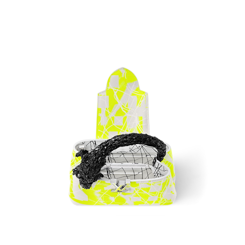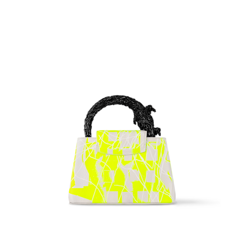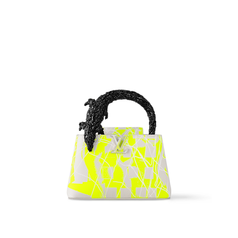 루이 비통 x 프랭크 게리의 협업 컬렉션에서 선보이는 화려한 카퓌신 BB 크록 핸드백. 네온 옐로우 색상의 디지털 프린트를 입힌 토뤼옹 가죽 소재. 현재 런던에서 전시 중인 프랭크 게리의 거대한 조각품에서 영감을 받아 독특하면서도 우아한 파충류 형태로 주조한 블랙 색상 브라스 소재의 핸들. 프린트를 더한 레진 소재의 LV 시그니처. 시적 감성을 가득 담아낸 경이로운 아이템.