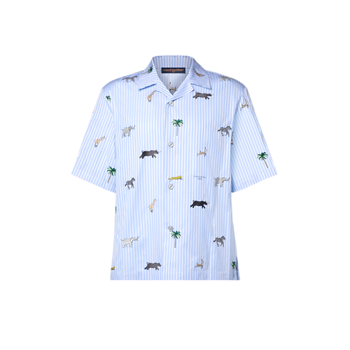 스트라이프 디테일을 더한 페일 블루 및 화이트 색상의 반소매 셔츠. 2026 봄-여름 패션쇼에서 선보인 루이 비통 x 다즐링 리미티드 모티프가 특징. 식물과 동물을 주제로 한 향수 어린 자수를 수놓아 여행 예술을 기념하는 디자인. 앞면을 은은하게 장식하는 루이 비통 파리 레터링 자수. 매칭되는 쇼츠와 함께 산뜻한 여름철 룩을 연출할 수 있는 아이템.