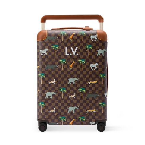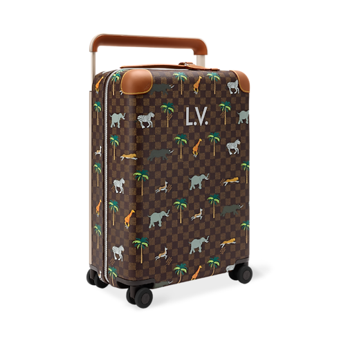 LV x 더 다즐링 리미티드 컬렉션에서 선보이는 다미에 에벤 헤리티지 캔버스 소재의 호라이즌 55 롤링 수트케이스. 사바나의 야생동물 일러스트가 특징. 강화된 모서리와 케인 핸들에 더해진 브라운 가죽 트리밍이 깊이 있는 색조를 한층 강조하는 디자인. 넉넉한 내부 공간을 갖춘 기내 반입 크기의 아이템.