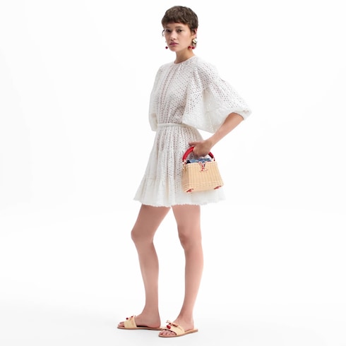 루이 비통 x 무라카미 다카시 리에디션 컬렉션에서 대담하고 경쾌한 디테일을 더해 세련된 감성으로 선보이는 상징적인 카퓌신 미니. 정교하게 짜인 라탄 소재로 꾸미지 않은 듯 감각적인 여름철 룩을 연출한 메인 바디 부분. 컬러풀한 체리 모티프를 더한 모노그램 데님 소재의 상단 플랩. 강렬한 레드 색상의 상단 핸들, 브레이디드 스트랩 및 LV 이니셜.