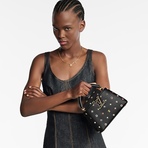 루이 비통 모노그램의 130주년을 기념하며 무라카미 다카시와의 협업으로 선보이는 우아한 카퓌신 미니. 카우하이드 소재. 멀티컬러 LV 플라워 스터드와 LV 이니셜을 장식해 꾸뛰르에서 영감을 받은 마감을 구현한 아이템. 다양하게 착용할 수 있고 두 가지 스타일로 연출할 수 있으며 우아한 이브닝 룩에 어울리는 아이템.
