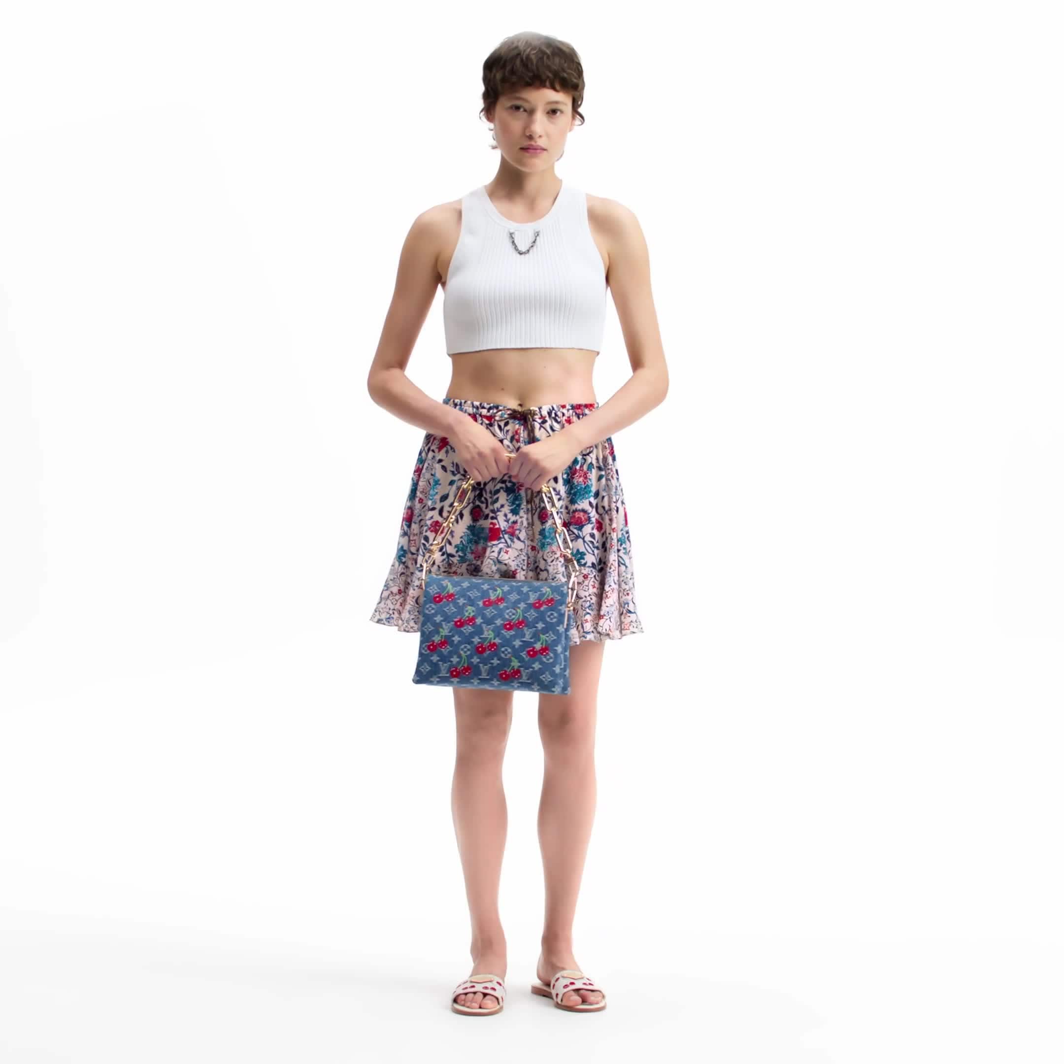 생기 넘치는 루이 비통 x 무라카미 다카시 리에디션 컬렉션으로 선보이는 아이코닉한 쿠상 PM. 일본 예술가 무라카미 다카시의 대담하고 경쾌한 시그니처 스타일이 반영된 체리 모티프를 수놓은 모노그램 데님 소재로 새롭게 구현한 디자인. 골드 색상의 탈착형 체인 및 조절 가능한 가죽 스트랩. 대형 스마트폰을 포함한 일상 필수품이 쏙 들어가는 내부.