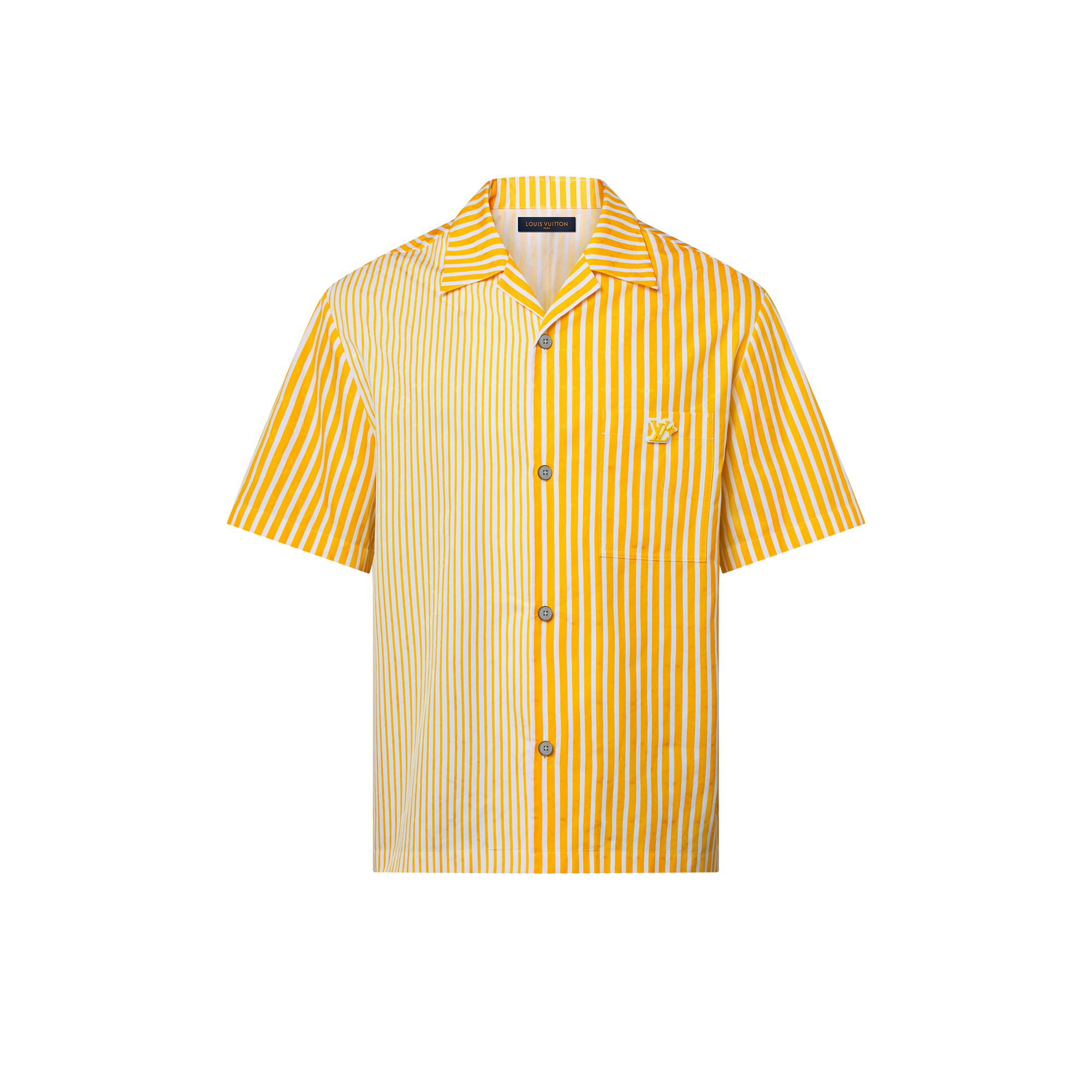 여름 감성이 느껴지는 가벼운 면 소재의 드로스트링 팬츠. 모노그램 자카드 바탕에 생기 넘치는 옐로우 색상의 스트라이프를 프린트한 디자인. 넓은 스트라이프 패턴으로 시선을 사로잡는 패치워크 효과를 구현한 뒷면 포켓. 경쾌한 분위기를 더하는 고무 소재의 LV 플라워 패치. 매칭되는 셔츠와 함께 산뜻하고 그래픽한 세트 룩을 연출할 수 있는 아이템.