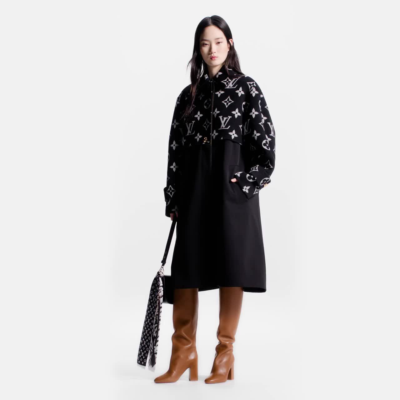 그래픽한 오버사이즈 모노그램 자카드를 입힌 도톰한 더블 페이스 캐시고라 소재의 상단과 무늬 없는 블랙 색상의 테크니컬 개버딘 소재로 완성한 대조적인 하단이 조화를 이루는 감각적인 코트. 우아한 엔벨로프 핏을 연출하는 넉넉한 스트레이트 실루엣. 세련된 분위기를 더는 칼라 및 골드 색상의 브레이디드 버튼.
