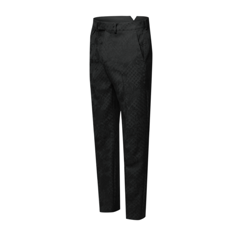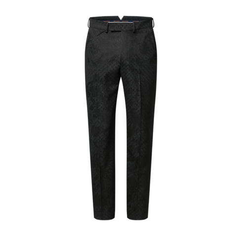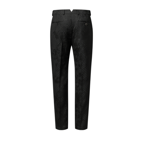 고급스러운 울 자카드 소재로 선보이는 감각적인 블랙 색상의 이브닝 팬츠. 질감을 살린 매력적인 마감의 톤온톤 모노그램 와일드플라워 모티프가 특징. 우아한 퐁 뇌프 실루엣. 오른쪽 힙 부분의 LV 이니셜을 자수로 새긴 삼각형 탭과 웨이스트 밴드 뒷면의 Marque L.Vuitton Déposée 라벨이 돋보이는 디자인. 매칭되는 재킷과 함께 착용하여 세련된 수트를 연출할 수 있는 아이템.