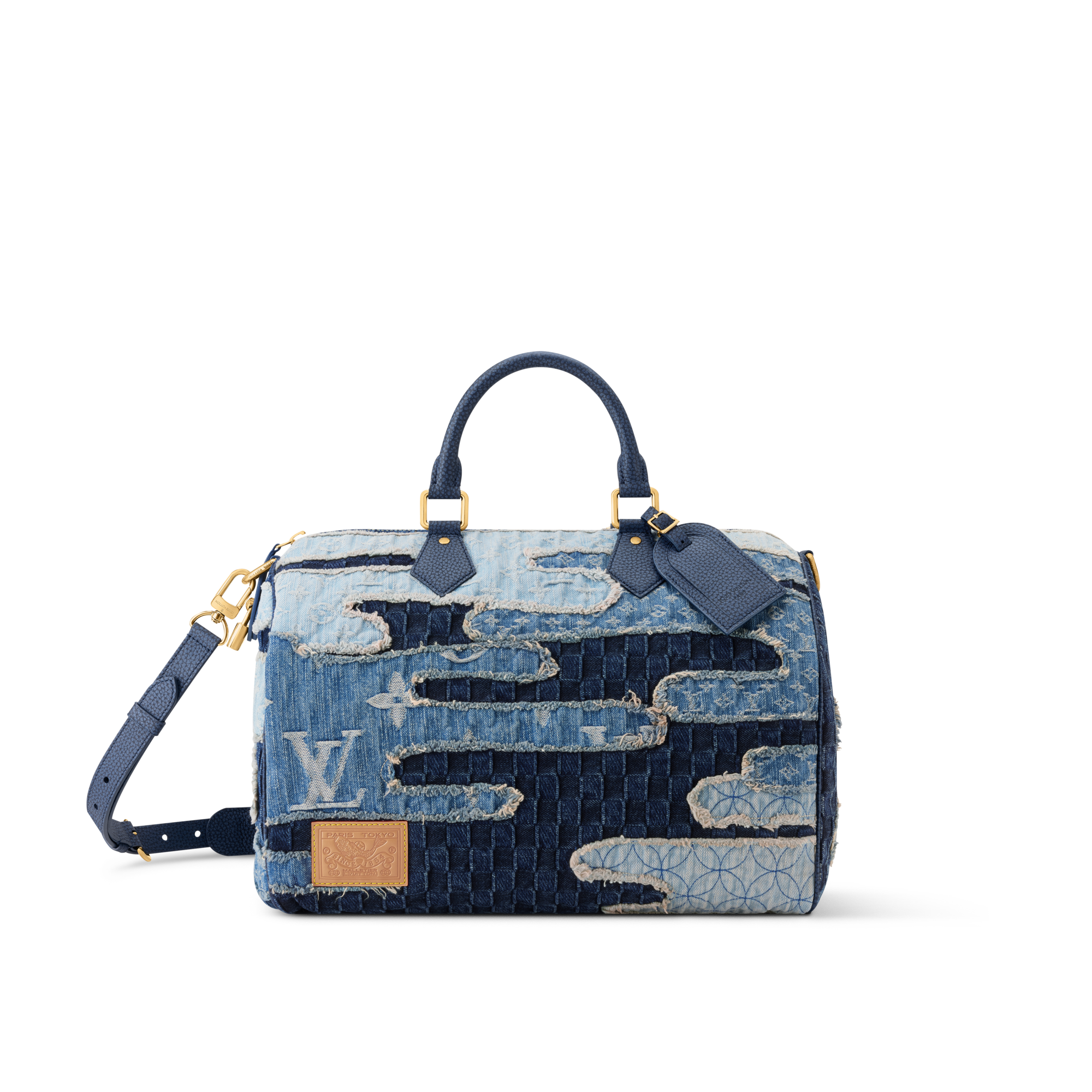 블루 및 그린 색조의 다미에 헤리티지 캔버스 소재로 우아한 매력을 불어넣은 유연한 스피디 40 반둘리에. 블루 색상 카우하이드 가죽 소재의 상단 핸들, 분리 가능한 숄더 스트랩 및 빈티지한 분위기를 선사하는 탈착형 LV 글로브 택을 구성한 디자인. 하우스의 상징적인 모노그램 코팅 캔버스 소재의 안감.