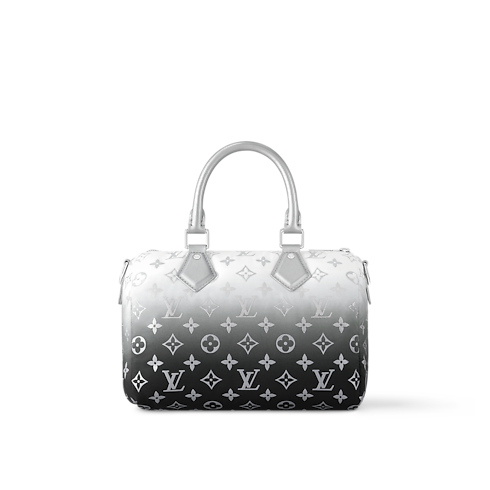 LV 스노우 컬렉션에서 그라디언트 실버 색조의 새로운 모노그램 나일론 소재로 선보이는 스피디 반둘리에 25(Speedy Bandoulière 25). 실버 색상의 하드웨어와 시그니처 플라워 참이 돋보이는 컴팩트한 스타일. 스마트폰, 월릿, 열쇠와 같은 기본 소지품을 보관할 수 있는 크기. 조절 가능한 탈착형 스트랩을 활용하여 다양하게 연출할 수 있는 아이템.