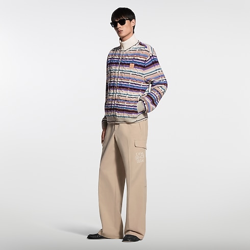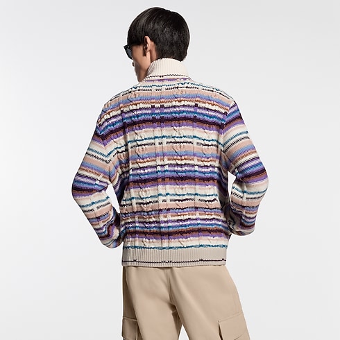 수작업으로 완성한 듯한 고급스러운 울 캐시미어 소재의 트랙 톱. 질감을 살린 케이블 니트 소재에 다채로운 스트라이프를 더한 디자인. 지퍼형 잠금와 스탠드 칼라를 구성해 따스한 봄날 가디건 또는 가벼운 아우터로 활용하기 좋은 아이템. 스마트한 감각이 엿보이는 가슴 부분의 가죽 시그니처 패치.
