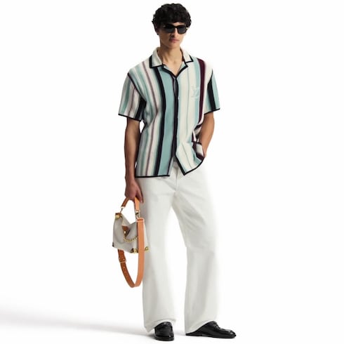 오가닉 면 소재의 수직 크로셰 스트라이프가 돋보이는 다채로운 반소매 셔츠. 새틴 같은 시그니처 디테일을 수놓은 가슴 부분과 뒷면. 자개 효과를 준 버튼이 장식된 여밈장치. 느슨하고 통기성 좋은 니트로 제작해 우아하면서도 여유로운 분위기를 선사하는 디자인. 매칭되는 쇼츠와 함께 크루즈 선박의 데크 위에서 여유를 즐길 때 입기 좋은 그래픽한 아이템.