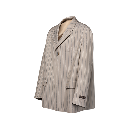 드롭 숄더 실루엣의 편안하고 가벼운 재킷. 2026년 봄-여름 패션쇼의 여유롭고 우아한 분위기를 담은 디자인. 베이지 색상의 스트라이프 울 실크 자카드 소재. 세련된 스트라이프 패턴의 안감을 덧댄 소매. 왼쪽 팔 부분을 장식한 브라운 색상 가죽 소재의 루이 비통 파리 패치. 매칭되는 코트와 함께 레이어드 룩을 연출할 수 있는 아이템.