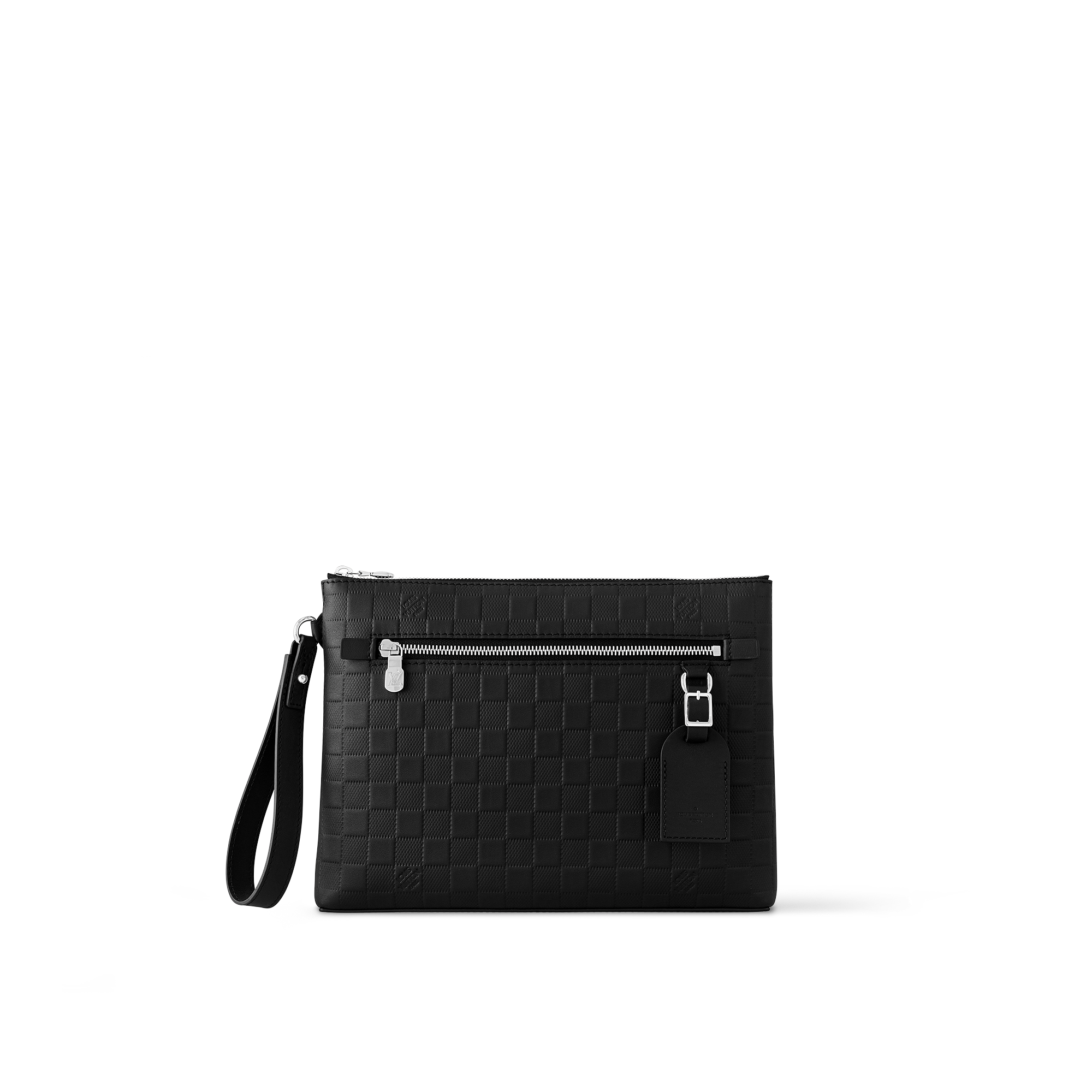 왁스 처리한 송아지 가죽 소재와 블랙 색상의 하드웨어, 매칭되는 텍스타일 소재의 안감을 결합해 선보이는 테이크오프 파우치. 오피스 룩과 캐주얼한 룩에 모두 어울리는 작지만 태블릿 PC를 수납할 수 있는 넉넉한 크기의 디자인. 앞면의 모서리에 양각으로 새긴 우아한 LV 이니셜 장식. 탈착형 손목 스트랩을 활용해 다양하게 연출할 수 있는 아이템.