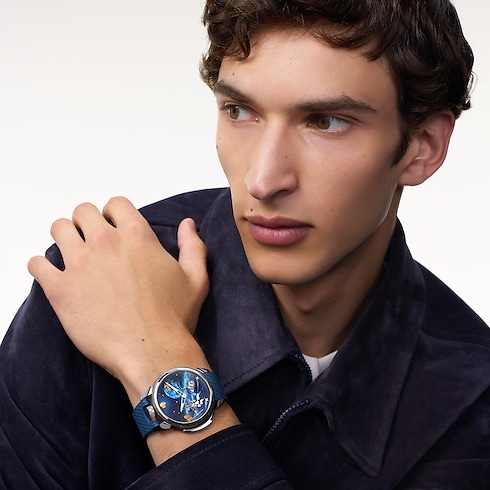 탐험과 혁신이 만나는 담대한 우주 대서사로 초대하는 땅부르 타이코 갈락티크(Tambour Taiko Galactique). 루이 비통의 오토마타 여정의 새로운 챕터를 여는 타임피스. 미래지향적 디자인이 돋보이는 새로운 티타늄 소재와 화이트 골드 소재의 케이스. 12시 위치에 배치한 크라운.